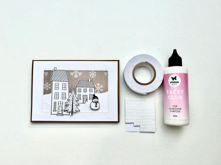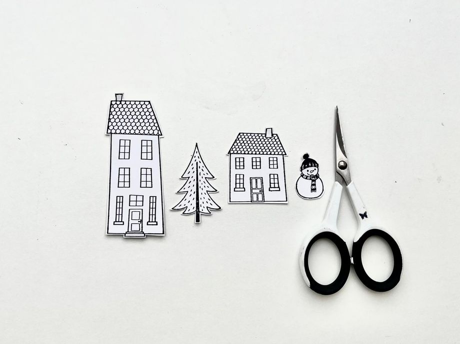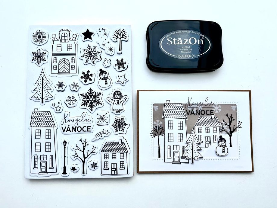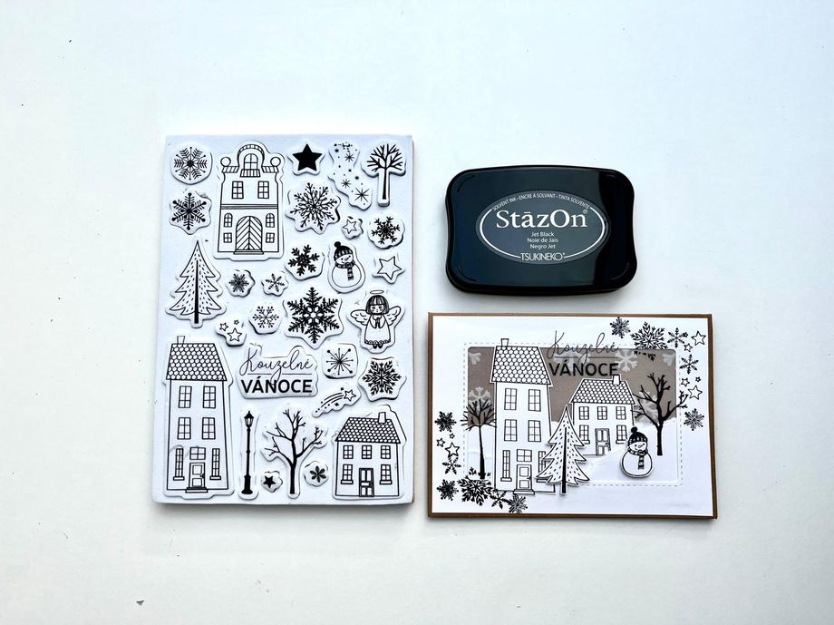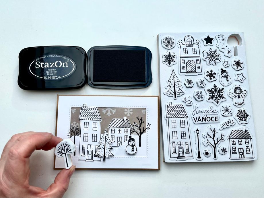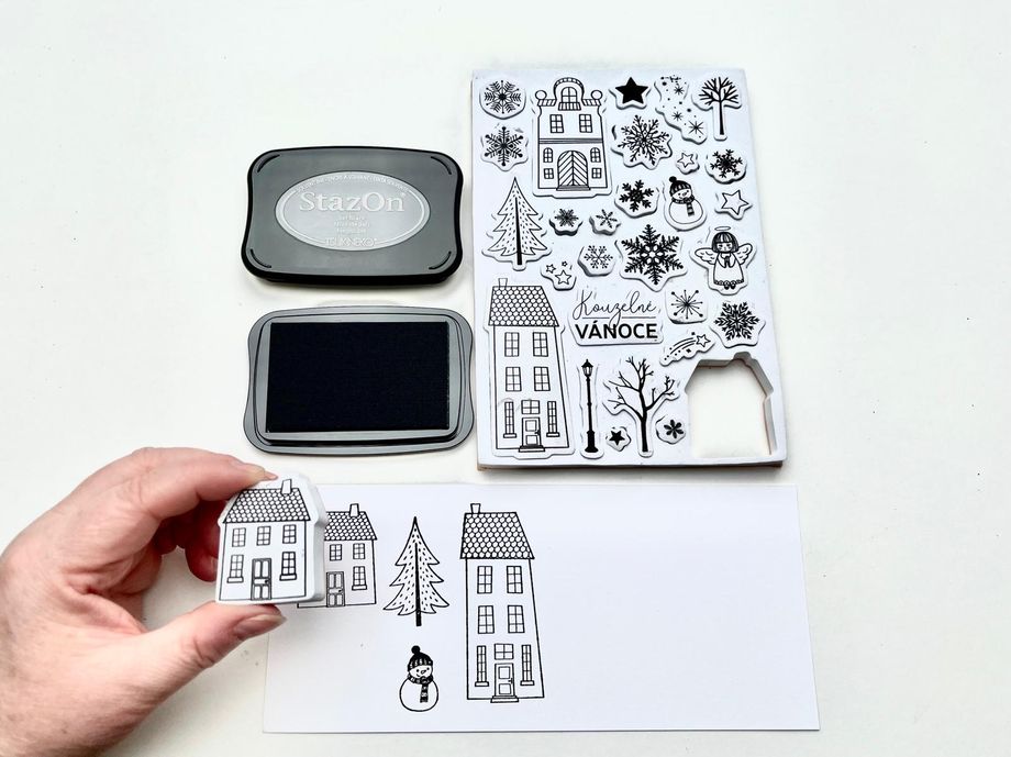 8. Na další bílý papír narazítkujeme dva domečky, strom a sněhuláka. Používáme permanentní razítkovací polštářek.