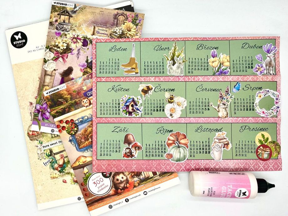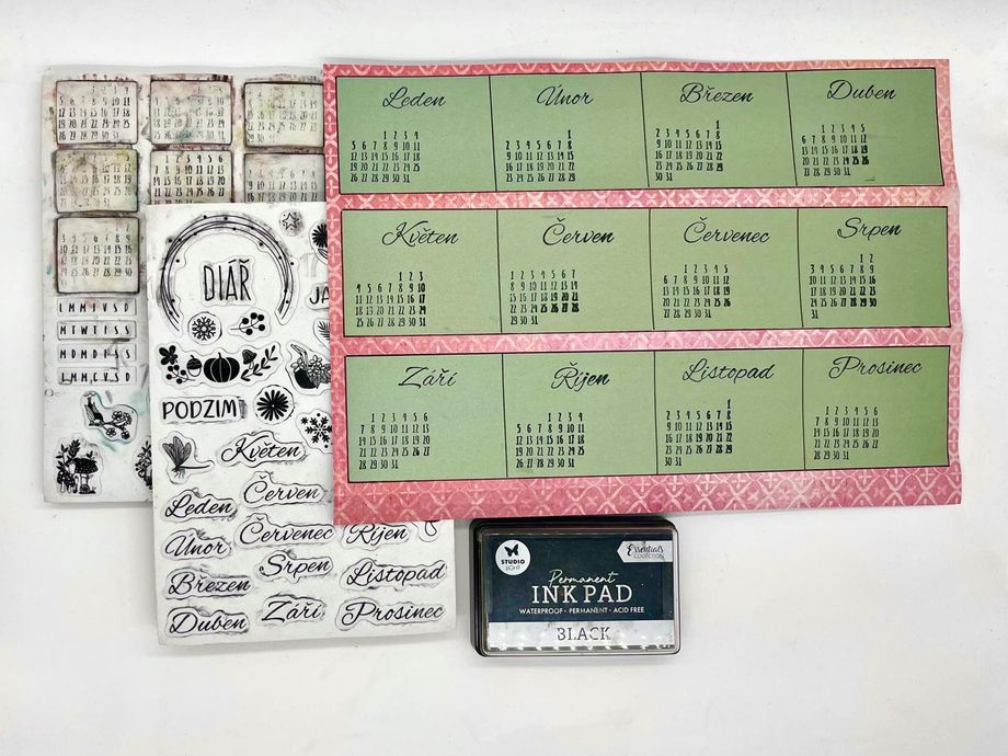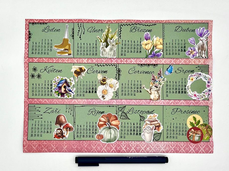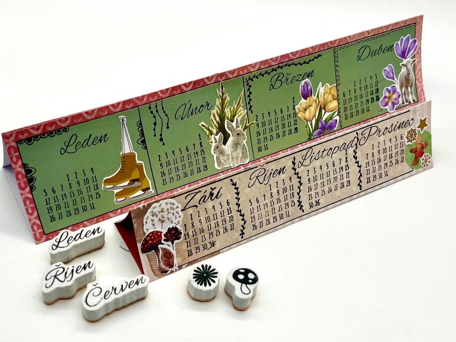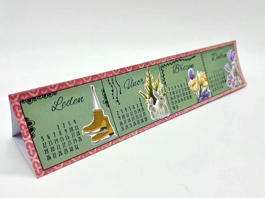 Jednoduchý kalendář Návody 20. 1. 2026 Hledáte jednoduché tvoření, které je zároveň praktické? V tomto návodu vám ukážeme, jak vyrobit malý stolní kalendář, který se vejde na pracovní stůl i poličku. Zvládnou ho dospělí i děti a výsledek vám bude dělat radost po celý rok. Aktuality Bullet Journal Tvoření z papíru Potřebný materiál a pomůcky: Barevný nebo vzorovaný papír Jednobarevný papír Pravítko Obyčejná tužka Tekuté lepidlo Nůžky Knihařská kost na rýhování Černý liner Sada razítek „Kalendárium“ Sada razítek „Roční období“ Černý razítkovací polštářek Vylupovací obrázky Postup: 1. Nachystáme si barevný nebo vzorovaný papír o velikosti A4 a narýhujeme ho dle nákresu a jednotlivá políčka naohýbáme. 2. Z jiného, tentokrát jednobarevného papíru (doporučujeme světlejší odstín), si nachystáme 3 proužky o velikosti 28 x 5,5 cm a nalepíme je doprostřed jednotlivých políček. 3. Každý pásek rozdělíme na čtyři stejná políčka, rýsujeme černým tenkým fixem. Vznikne nám tak 12 obdélníčků – na každý měsíc v roce jeden. 4. Do každého políčka narazítkujeme černým razítkovacím polštářkem příslušné kalendárium a také název měsíce. 5. Dozdobíme vylupovacími obrázky. 6. Černým linerem ještě můžeme dokreslit drobnosti – ozdobné rámečky, kytičky, lístky apod. 7. Poslední úzké políčko kalendáře potřeme lepidlem a slepíme celý kalendář v trojúhelníkový stojánek. Máme hotovo. Další tipy pro vás: Políčka můžeme také nazdobit některými z široké nabídky razítek. Také samolepky budou k dozdobení kalendáře perfektní. Kalendář můžete zhotovit i v jiných velikostech. Zpět do kategorie Další podobné články Návody Jak vyrobit vlastní washi pásku 31. 12. 2025 Washi pásky jsou důležitou dekorativní součástí každého diáře. Není potřeba kupovat pořád další, ukážeme vám, jak lze pomocí razítek snadno vyrobit vlastní. Návody Vylaďte si kreativní diář dle svých představ 31. 12. 2025 Váš bullet journal nemusí být jen praktický, ale i krásný. Jak nazdobit jeho obal, který je nejen funkční, ale i estetický? Nechte se inspirovat v článku, kde najdete přehledné tipy a postupy, jak ho vkusně ozdobit, aby vás bavilo brát ho do ruky každý den. Návody Krabička z papíru na "neforemné" dárky 21. 12. 2025 Zabalit neforemný dárek bývá malá noční můra – papír se trhá, rohy odstávají a výsledek nikdy nevypadá tak, jak bychom si přáli. S jednoduchou papírovou krabičkou si ale poradíte i s těmi nejproblematičtějšími tvary. V tomto návodu vám krok za krokem ukážeme, jak si krabičku snadno vyrobit doma, rychle a bez…