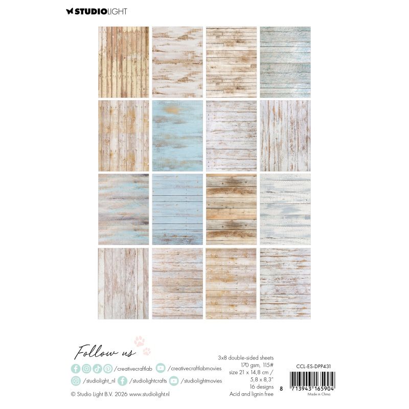 Kreativní sada papírů v bloku s motivy jemně oprýskaných dřevěných planěk a masivního dřeva ve světlých barvách z dílny nizozemské značky Studio Light se hodí na scrapbooking, cardmaking a další vyrábění. Podkladový kreativní papír skvěle poslouží jako základ projektu, na který lze vrstvit další prvky – třeba naše oblíbené papírové výseky.