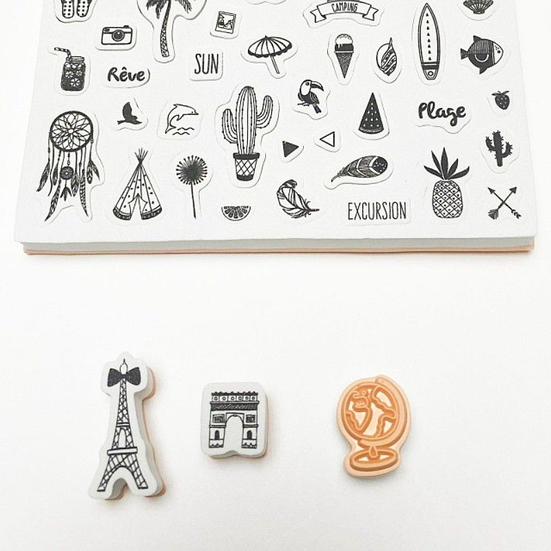 Sada obsahuje 81 razítek s motivy významných světových staveb a s ikonami z prázdnin, dovolených, výletů či cestování.