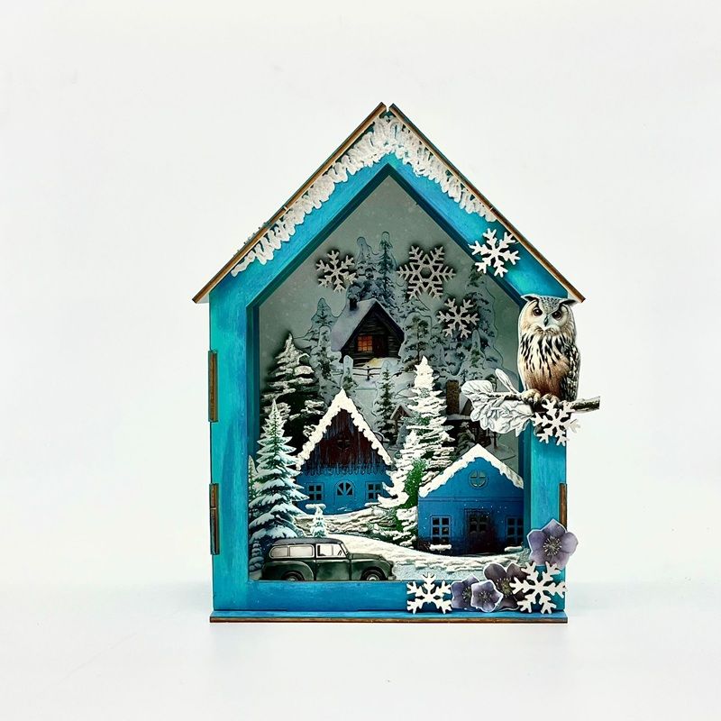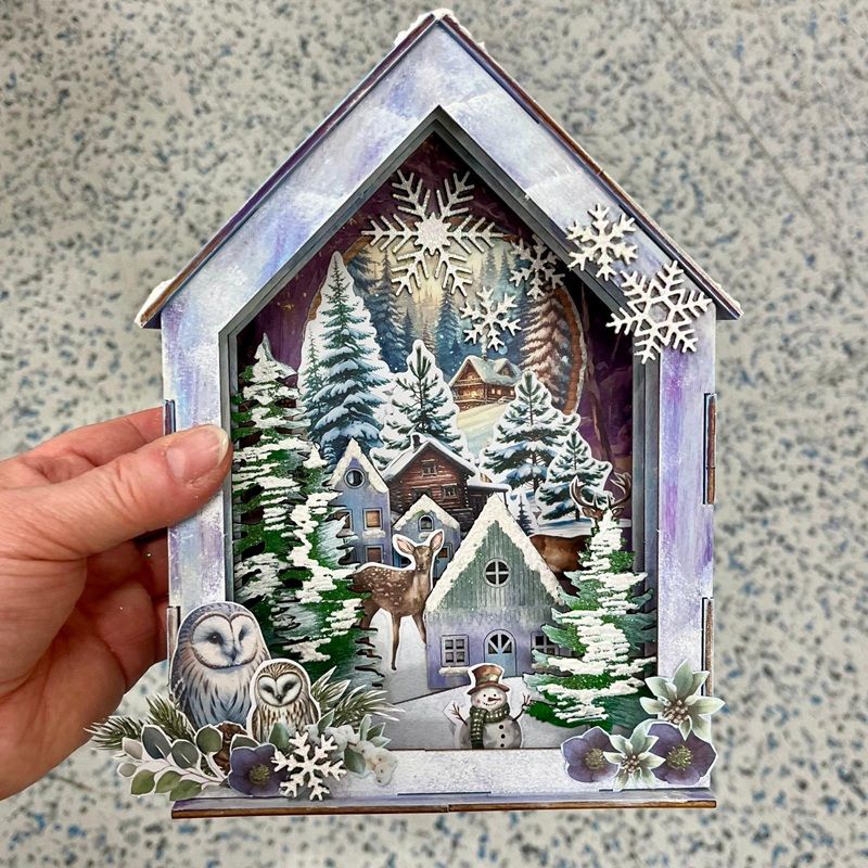 Na dozdobení domečku se zimní krajinou si bohatě vystačíte s papírenskými produkty Studio Light. Na větší plochy postačí papíry formátu A5. Nesestavené dílky můžete použít jako šablonu a obkreslit si na zvolený papír jejich tvar, který pak vystřihnete a nalepíte.