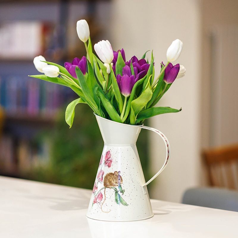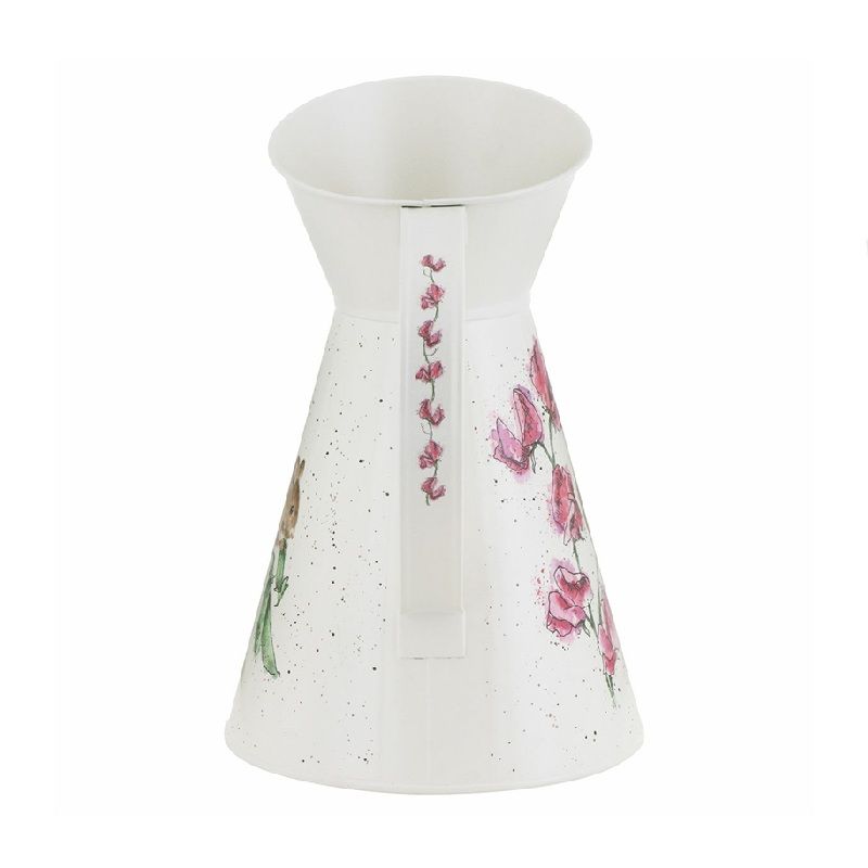 Ocelový džbán s velkým uchem bude elegantním domovem pro čerstvé i umělé květiny. Na jednoduchém kropenatém pozadí vyniká akvarelová ilustrace drobné myšky pochutnávající si na hrášku. Další drobné ilustrace jsou i na uchu a zespod džbánku.