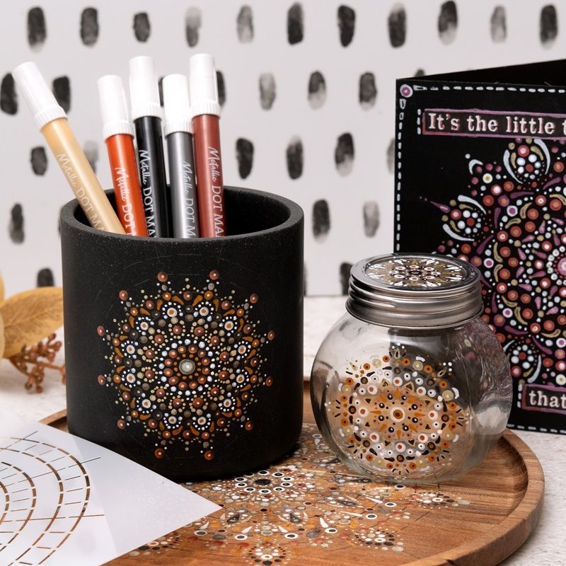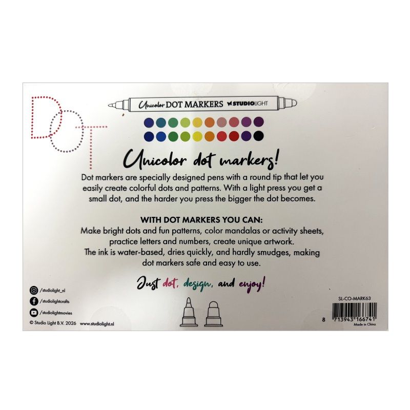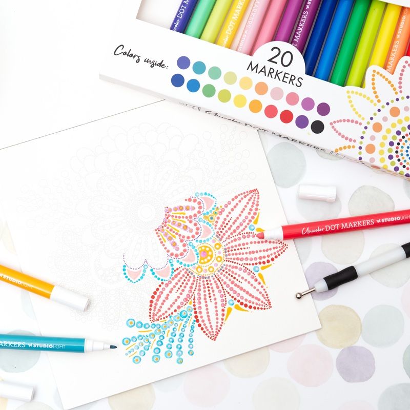 Velká sada fixů s kulatými hroty od nizozemské značky Studio Light je ideální na techniku tečkování (dot painting), při níž se tvoří oblíbené mandaly a další obrazce. Díky fixkám odpadá nutnost míchat akrylové barvy a pořizovat si speciální nástroje – můžete se plně oddat relaxačnímu tečkování!