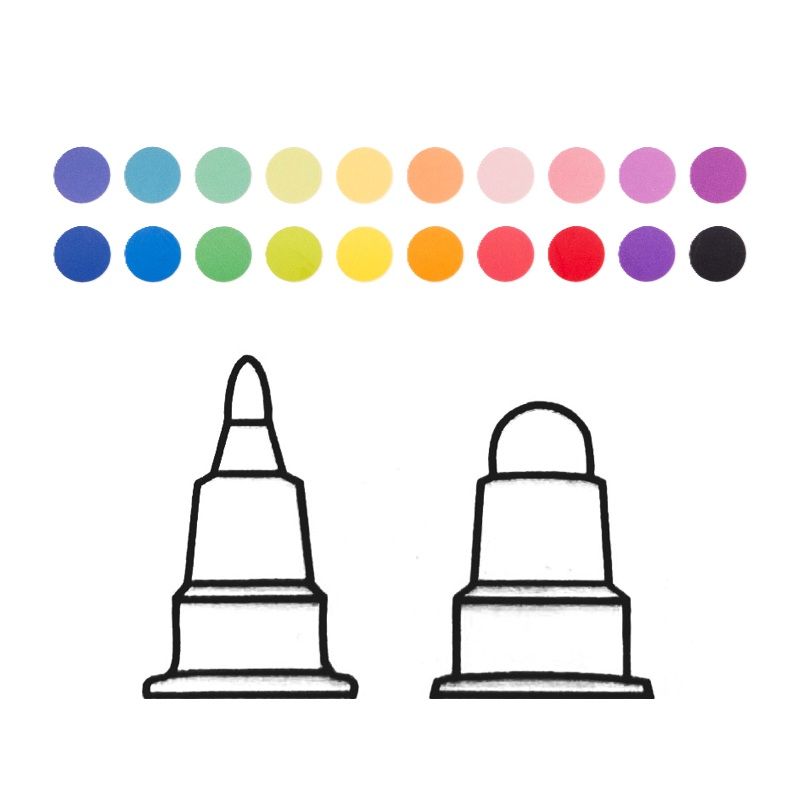 Oboustranné tečkovací fixy s kulatými hroty na techniku tečkování (dot painting). Vysoce krycí, permanentní na většině povrchů, vodní báze. Obsahuje 20 fixů v základních barvách. Celý popis