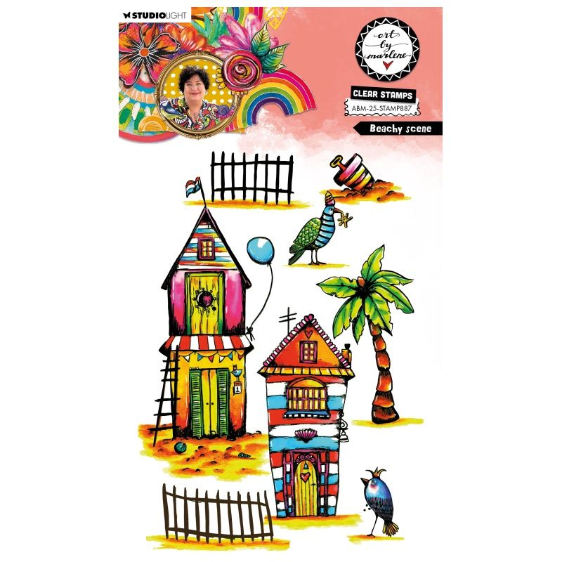 Gelová razítka v sadě s plážovými motivy, které navrhla umělkyně Art by Marlene , jejíž tvorba je svérázná a vesele barevná. Razítka jsou vyrobená z kvalitního čirého silikonu. Největší výhodou je jejich průhlednost – přesně vidíte, kam tisknete. Používají se s akrylovým blokem .