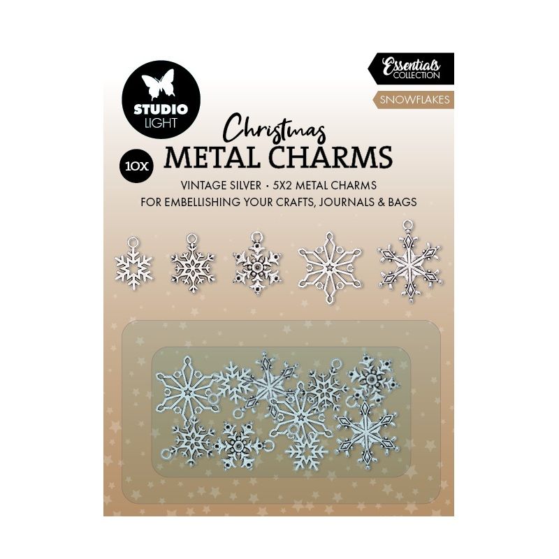 Kovové komponenty na kreativní projekty, scrapbooking, cardmaking, bižuterii apod. Rozměr balení 8,5 x 15 x 4 cm. Obsahuje 10 ks. Barva stříbrná, motiv sněhové vločky. Celý popis
