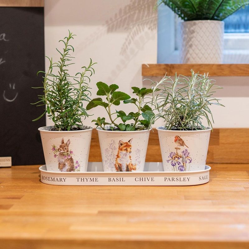 Plechové květináčky ve sladěné dárkové sadě jsou jako dělané k vystavení na parapetu v kuchyni ke kultivaci čerstvých bylinek na vaření. Tři stejně velké květináče kulatého tvaru sedí v ochranné spodní misce, díky níž je lze pohodlně přemisťovat a která zároveň ochrání okenní římsu před vlhkostí a nepořádkem.