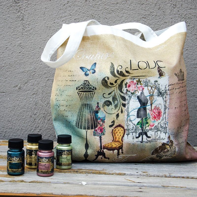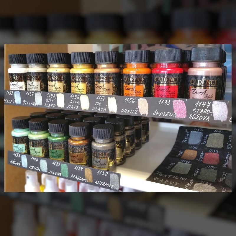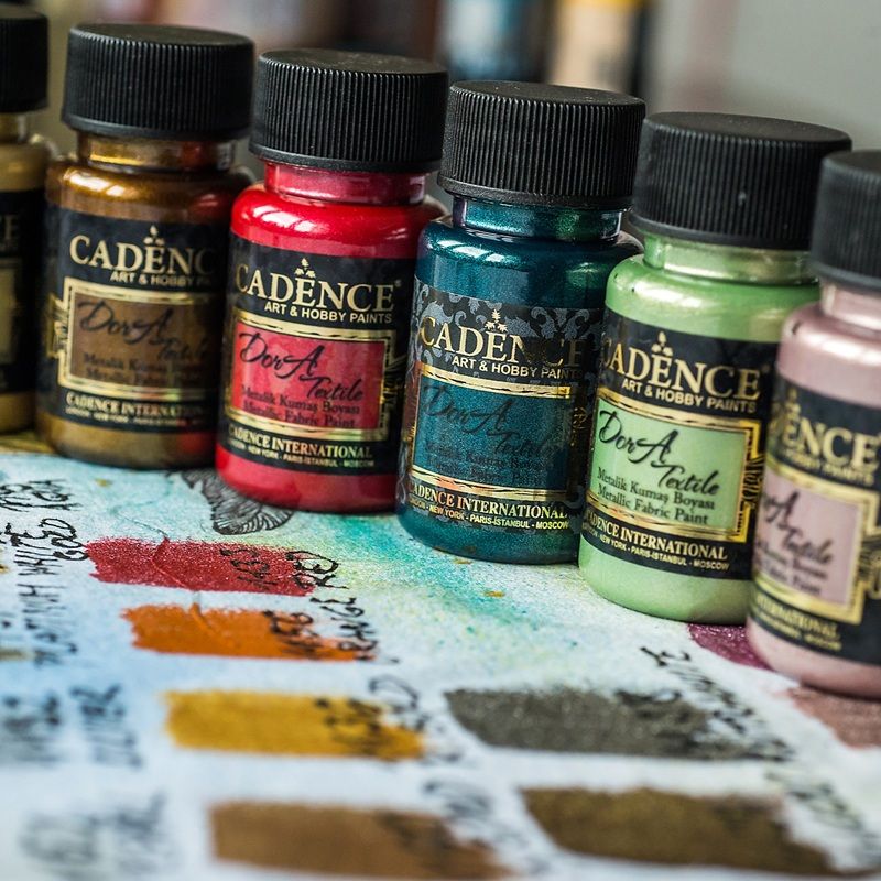 Metalická textilní barva Dora Textile od značky Cadence je sytě pigmentovaná, mimořádně zářivá s třpytivým efektem. Je ředitelná vodou a jednotlivé barvy se dají vzájemně míchat. Je vhodná na přírodní vlákna (bavlna, len, hedvábí) a látky s minimální příměsí umělých vláken. Úžasně vyniká na černém textilu a bílý textil naopak zjemní, skvěle ozvláštní i džínovinu. Lze ji použít samostatně nebo jí akcentovat již namalovaný obrázek. Namalovaný textil zůstává pružný, příjemný na nošení.
