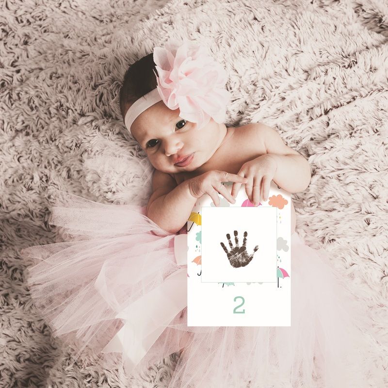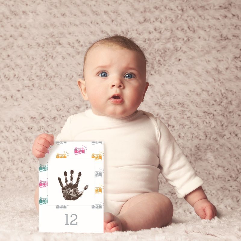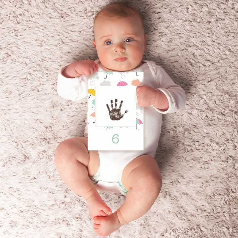 Každý měsíc miminku obtiskněte ruku na kartu a pak udělejte fotku. Schovejte si fotku i obtisk jako památku :)