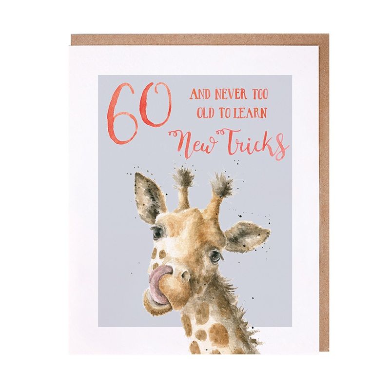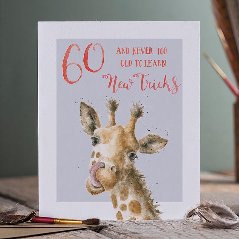 Sada přání a obálky od rodinné firmy Wrendale Designs s akvarelovou malbou žirafy od britské výtvarnice Hanny Dale má na přední straně nápis „60 and Never Too Old To Learn New Tricks“ – i v šedesáti se učím nové kousky.