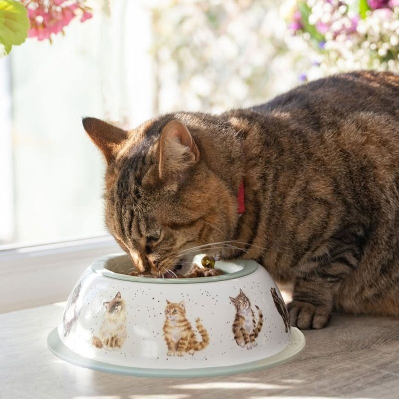 Kovová kočičí miska na vodu i krmivo bude krásným dárkem pro milovníky koček i pro vaši vlastní šelmu! Je ilustrovaná po celém vnějším okraji akvarelovými obrázky koček převzatých z maleb britské výtvarnice Hanny Dale, zakladatelky firmy Wrendale Designs.