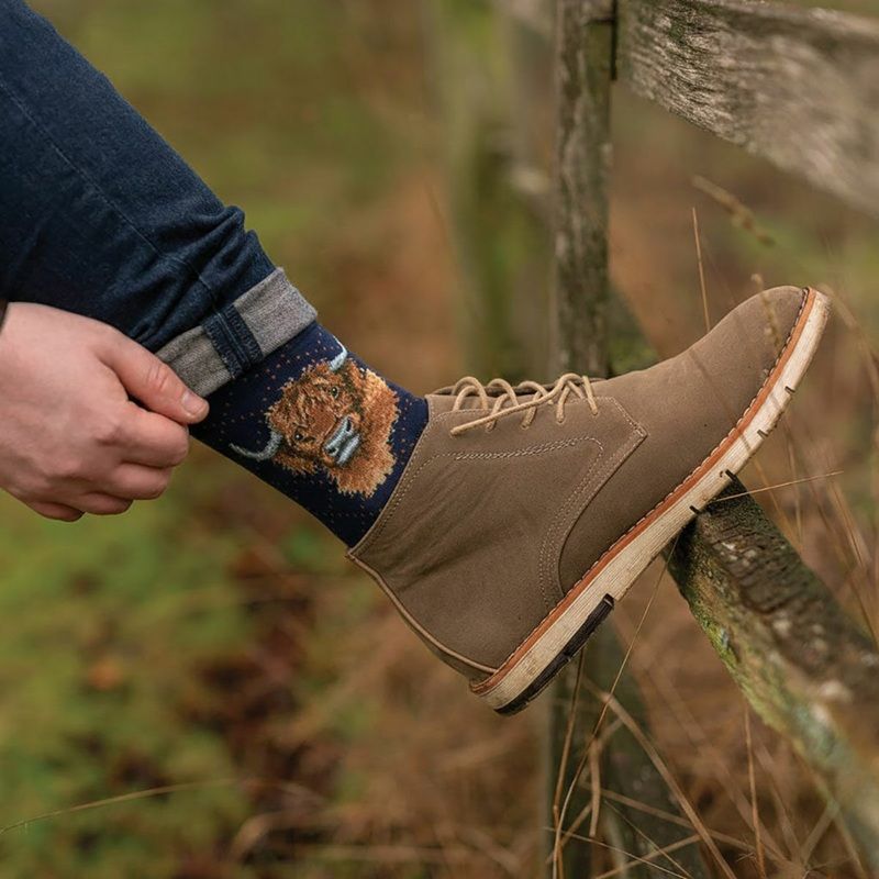 Jako všechny ponožky od britské značky Wrendale Designs jsou vyrobeny z měkoučkého bambusu, který je hřejivý a prodyšný, materiál je navíc antibakteriální a šetrný k přírodě. Lze prát v pračce na 40 °C. Jedna univerzální velikost (pánská 40–46).