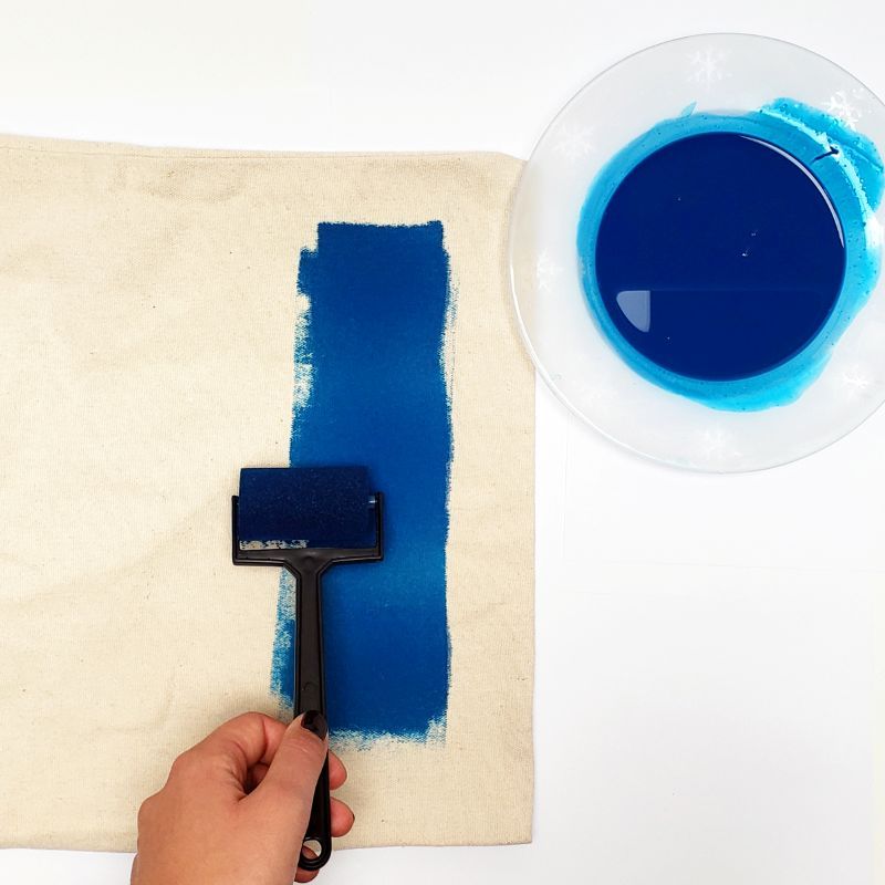 1. Akvarelový podkladPřipravte si misku s vodou, váleček namočte, vodu nechte do válečku nasát. Jemně odždímejte přebytečnou vodu. Do jiné misky si připravte trochu tekuté barvy – cca 0,5 dcl. Barvu nasajte do válečku. Váleček přiložte na textil a jemně nanášejte barvu. Pokud ve válečku dochází barva, nebojte se zvyšovat přítlak a válečkujte tak dlouho, dokud vám vyhovuje nanesené množství barvy. Pak opět namočte do barevné lázně a pokračujte ve válečkování. Válečkovat lze rovnoběžně, ale i různými směry.