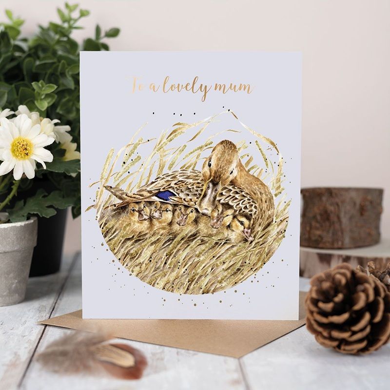 Sada přání a obálky od rodinné firmy Wrendale Designs s akvarelovou malbou kachní maminky a jejích kačátek od britské výtvarnice Hanny Dale má na přední straně lesklé zlaté detaily a nápis „To a lovely mum“ – milé mamince. Skvěle se bude hodit k narozeninám, svátku nebo na den matek .