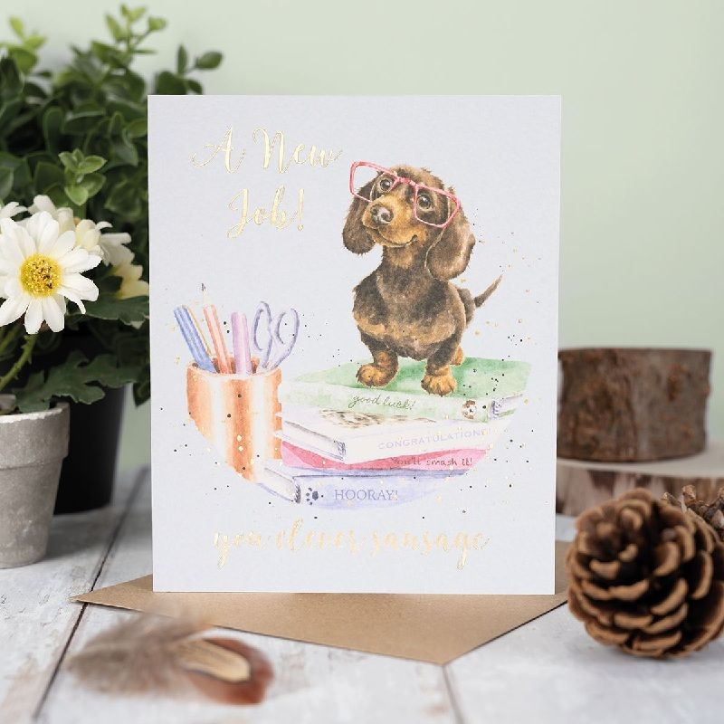 Sada přání a obálky od rodinné firmy Wrendale Designs s akvarelovou malbou profesionálního jezevčíka od britské výtvarnice Hanny Dale má na přední straně lesklé zlaté detaily a nápis „A new job! You clever sausage.“ – nová práce, jsi šikula! Skvěle se bude hodit jako vtipná gratulace k novému zaměstnání.