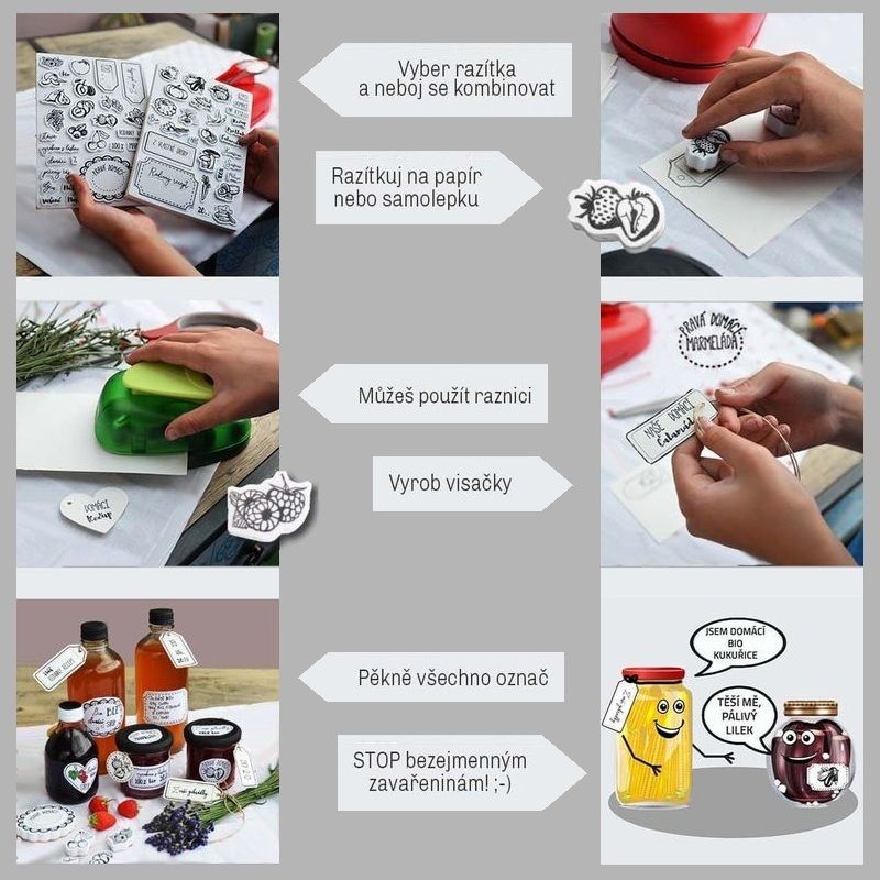 Každá domácí marmeláda, sirup, kompot nebo třeba pečený čaj potřebují svůj popis, abyste po čase věděli, co se ve skleničce ukrývá za dobrotu. Díky této sadě razítek si svoje zavařeniny krásně označíte. Ať už malinová, jahodová, z vlastní zahrádky, bio, všechny jsou 100 % vyrobené s láskou. Stejně jako tato razítka navržená výtvarnicí Irenou Slavíkovou.