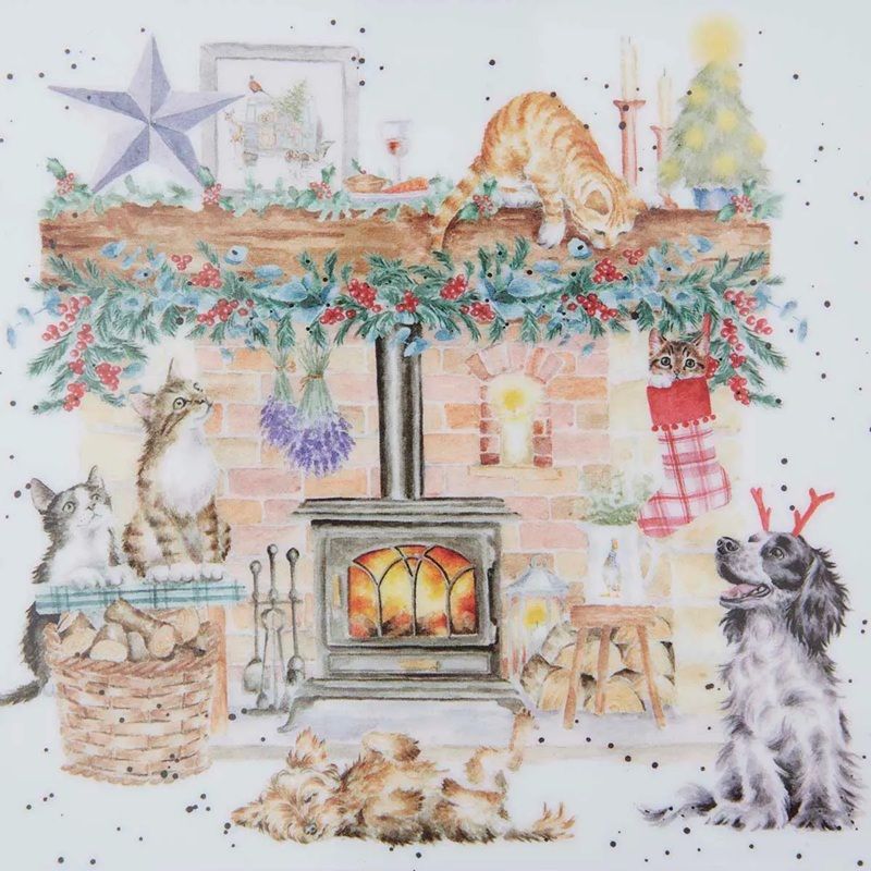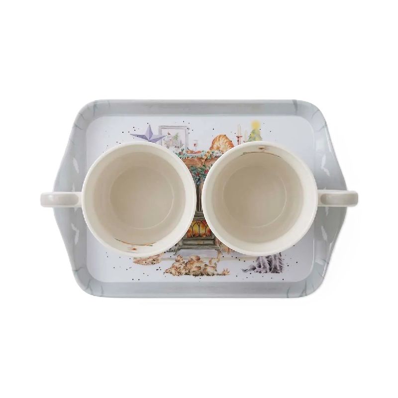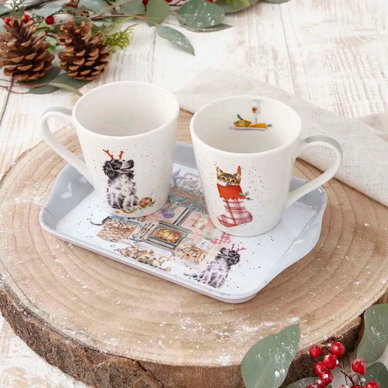 Na podnosu je malba koček a pejsků kolem slavnostně nazdobeného krbu, na hrnečcích jsou jednotliví mazlíčci připravení na Vánoce. Díky dárkovému balení bude tento set vhodným darem pod stromeček pro všechny pejskaře i milovníky kočiček.