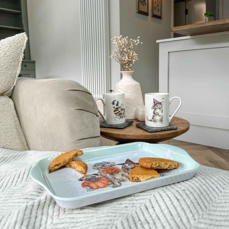 Tato roztomilá dárková sada Wrendale Designs obsahuje melaminový tác a dvojici hrnků značky Pimpernel z jemného kostního porcelánu, které zaručeně zpestří vaše stolování. Melaminový podnos je ideálním pomocníkem na servírování horkých nápojů anebo oblíbeného dezertu. Na podnosu je malba koček a pejsků o Halloweenu, na hrnečcích jsou jednotliví mazlíčci převlečení v kostýmech. Díky balení v krásné krabičce bude tento set vhodným dárkem, a to nejenom během strašidelných podzimních dní.