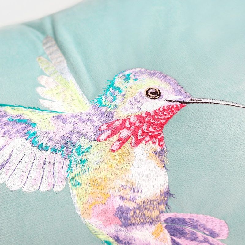 Tyrkysový povlak na polštář jednoduše promění obývací pokoj či ložnici ve stylu britské značky Wrendale Designs ! Vyroben je z recyklovaného materiálu, který je sametově hebký na dotek, a jeho přední stranu zdobí komplexní výšivka s kolibříkem věrně napodobující akvarelové malby Hanny Dale.